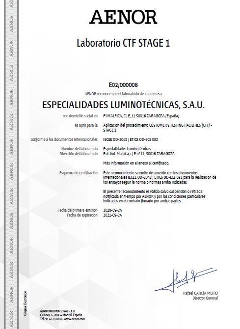 AENOR ha concedido la adhesión del Laboratorio de ELT a su sistema de ‘Customer Testing Facility (CTF) – Stage 1’, para las normas IEC 61347-1:2015, IEC 61347-2-13:2014+AMD:2016 e IEC 62384:2006+AMD1:2009 referentes a los requisitos de seguridad y funcionamiento de dispositivos de control.